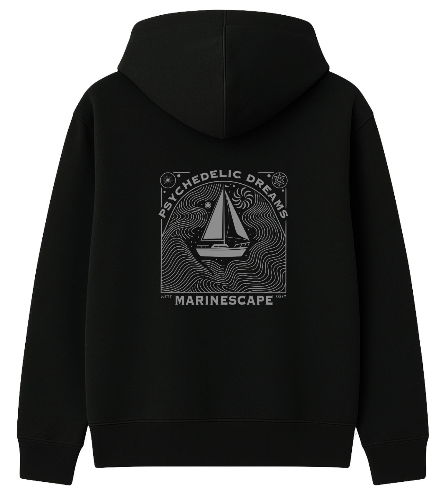 Este hoodie refleja los sueños psicodélicos de salir al mar. Inspirado en el viaje mental que provoca mirar el horizonte sin rumbo fijo.